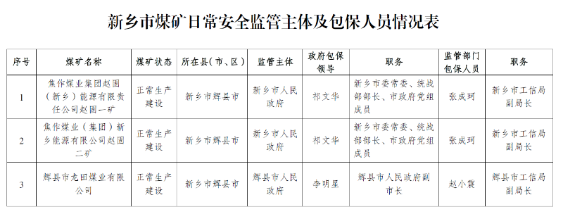 新乡市煤矿日常安全监管主体及包保人员情况表